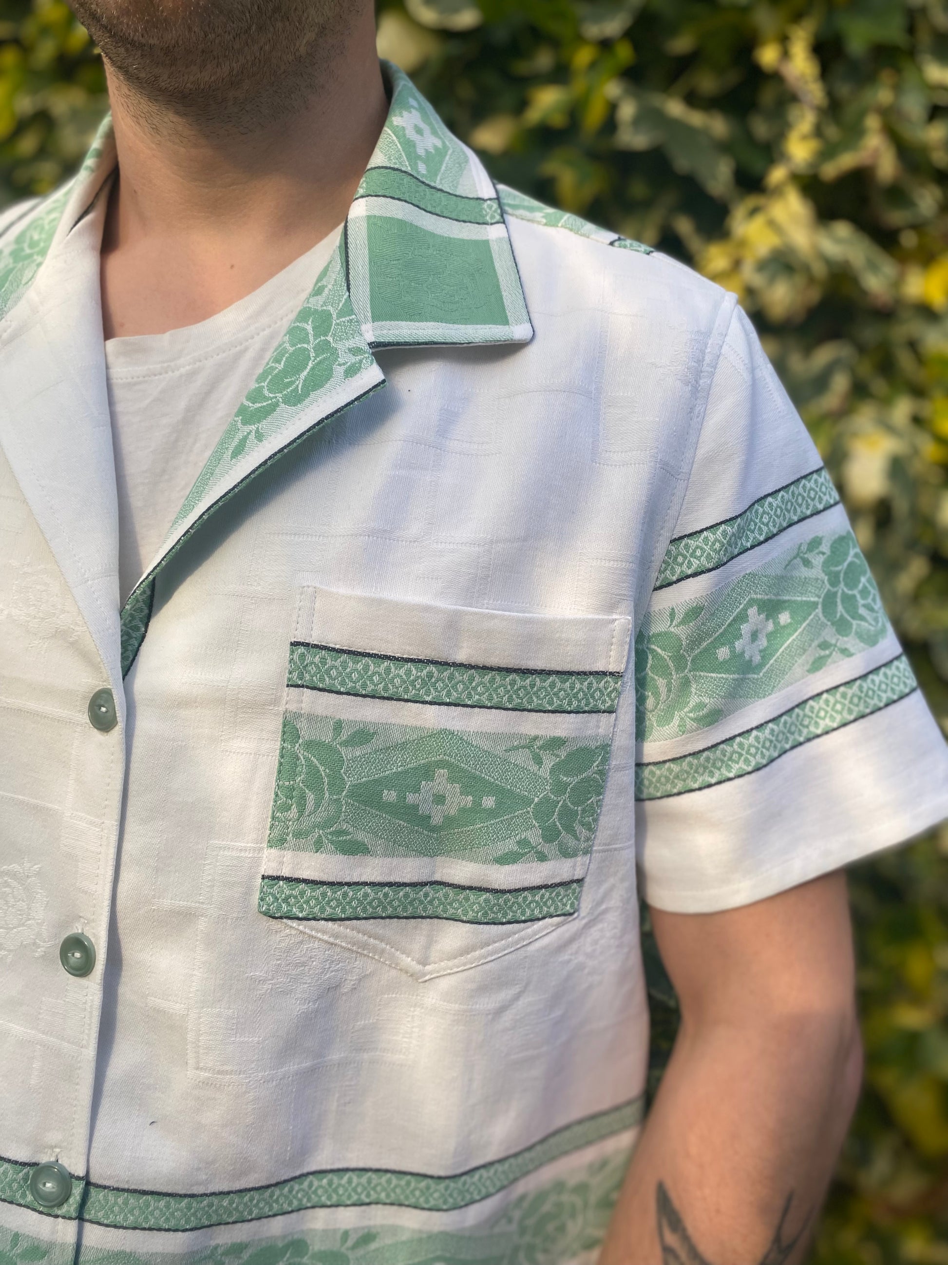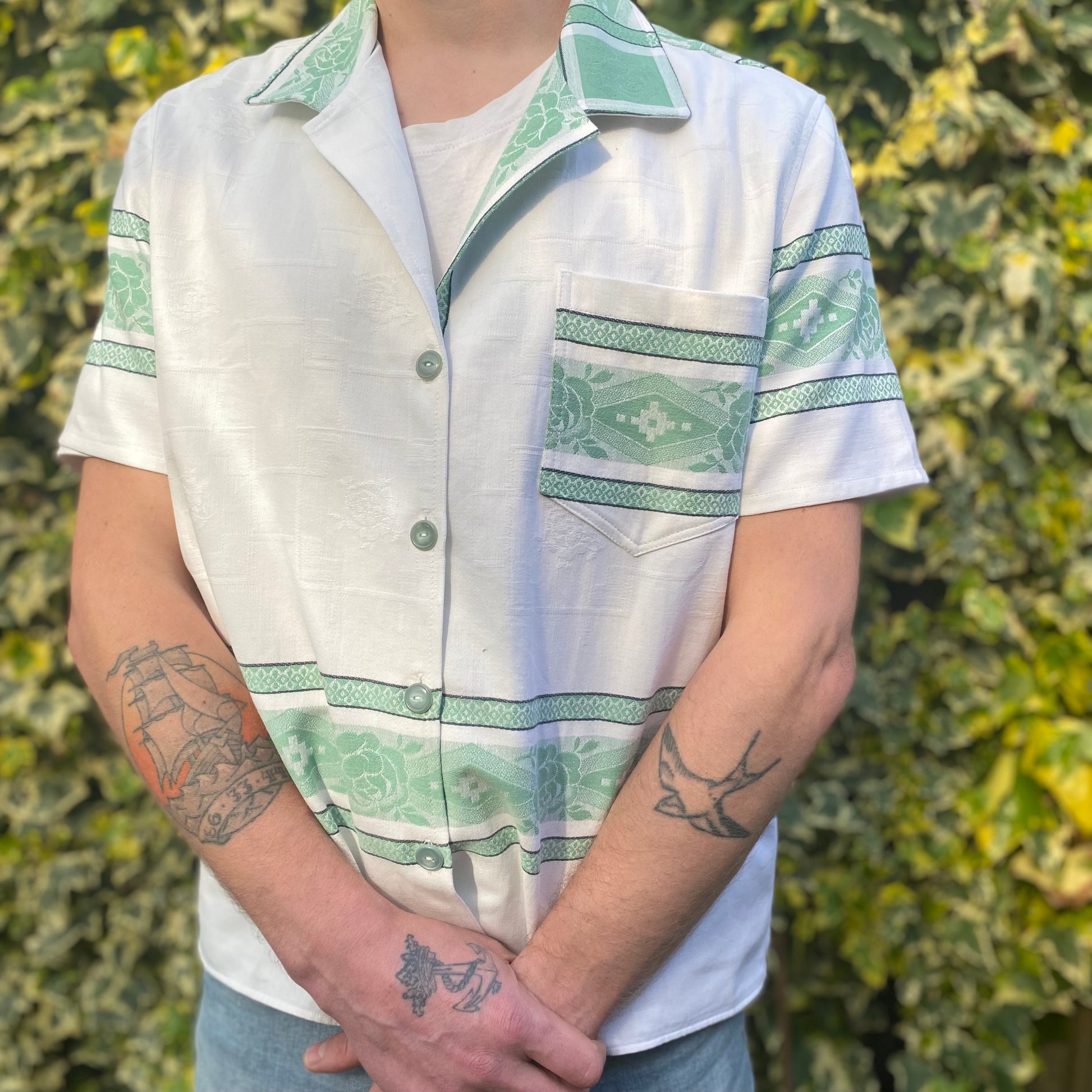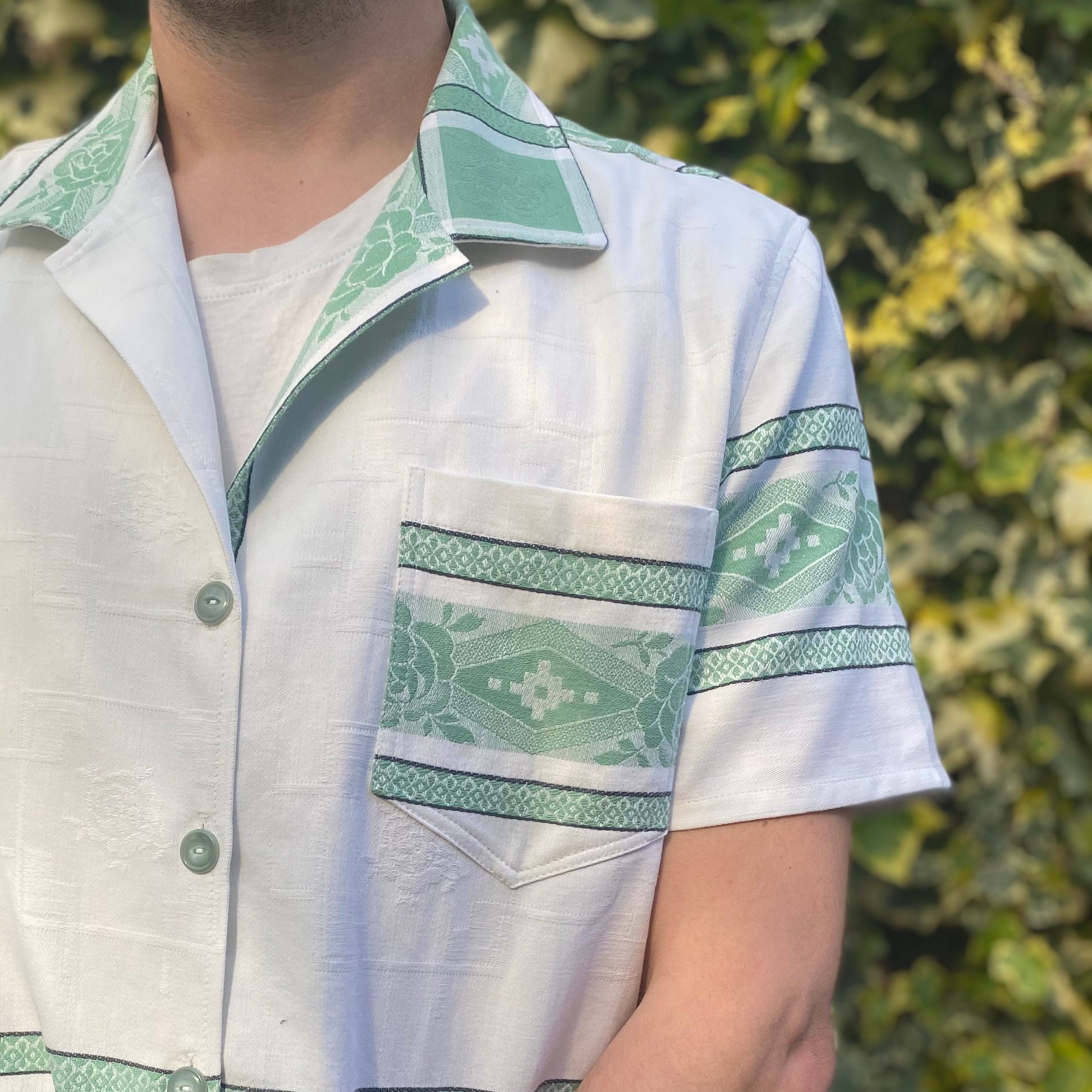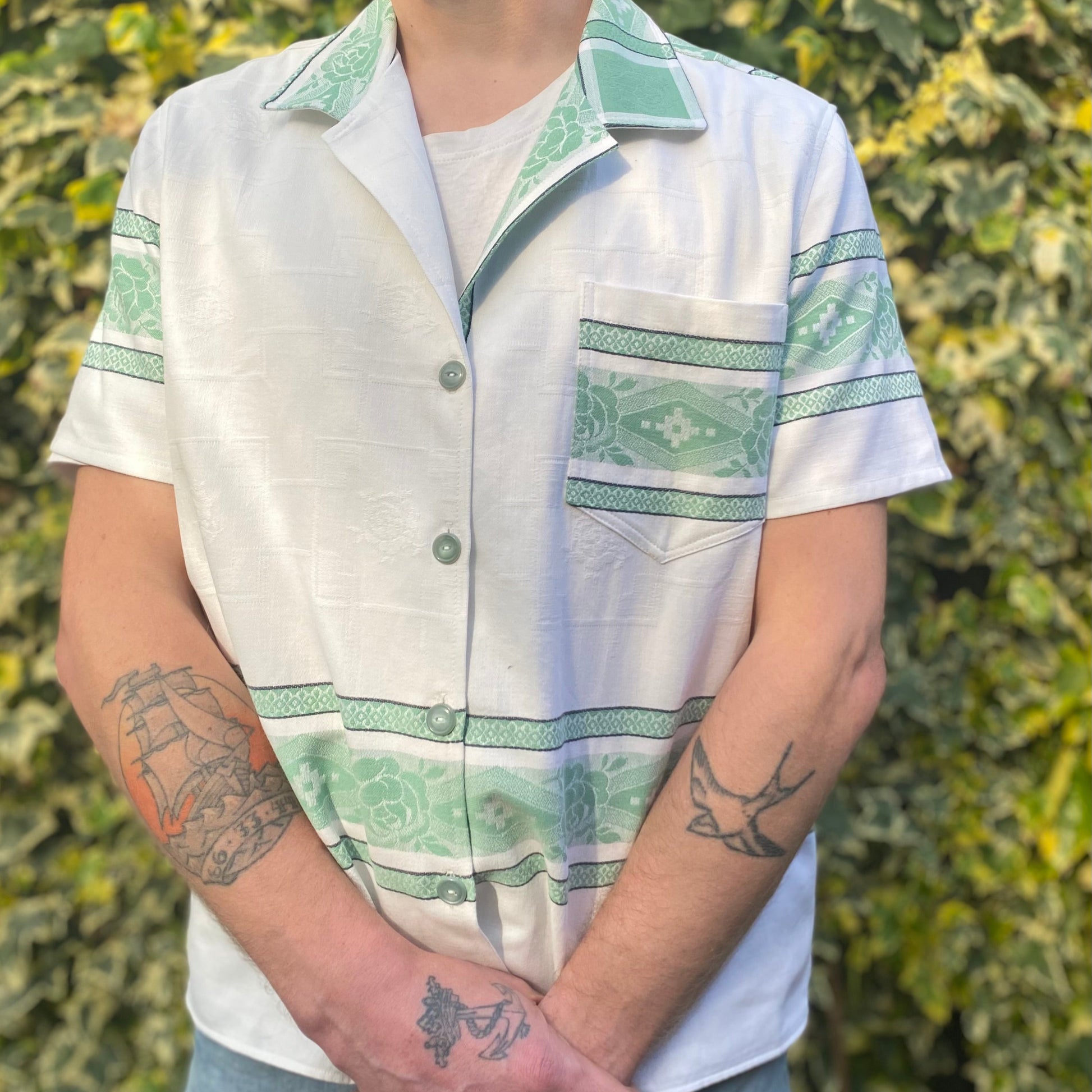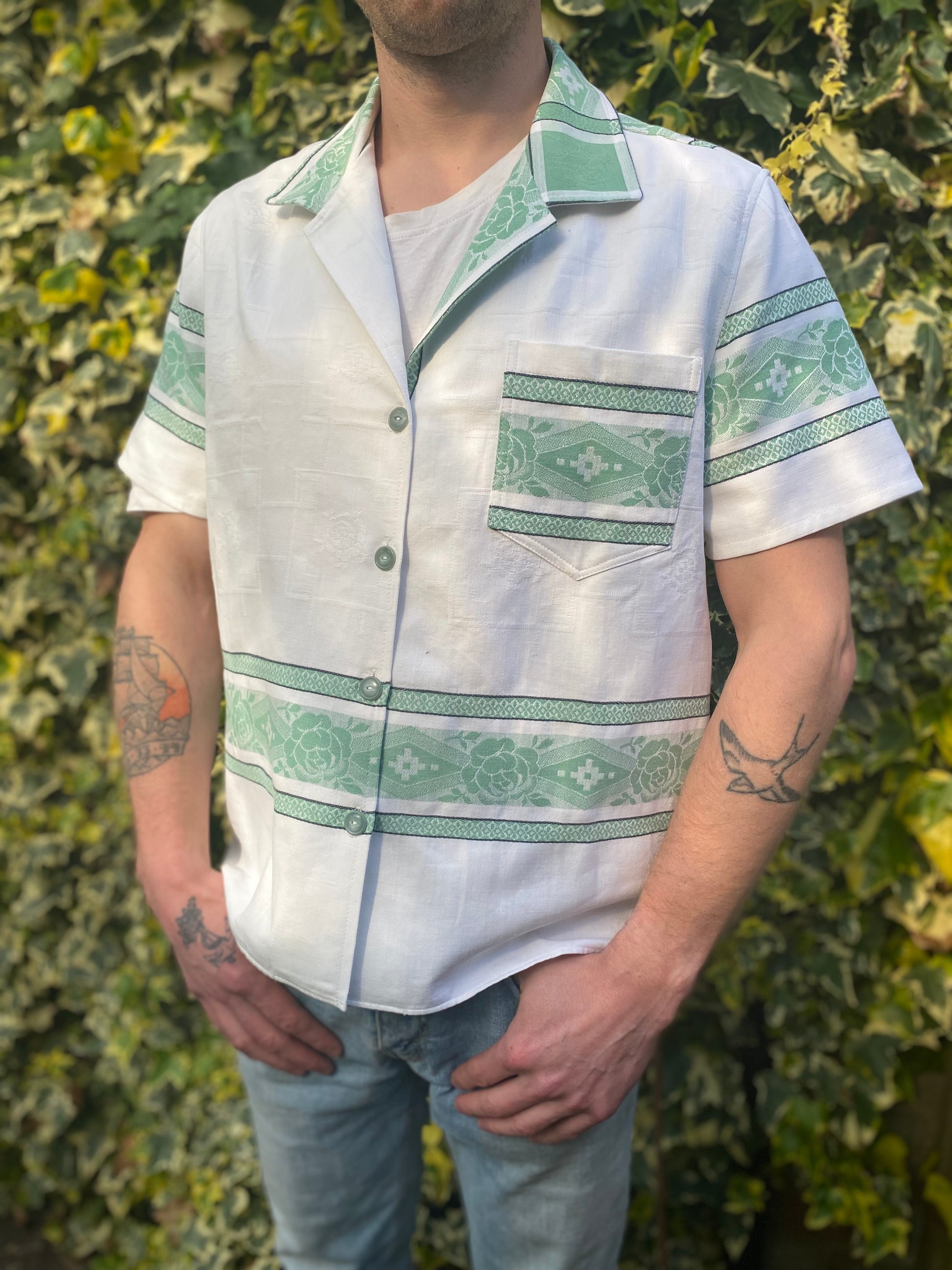 This shirt is a unique piece repurposing a vintage linen tablecloth. It is a boxy bowling style shirt.